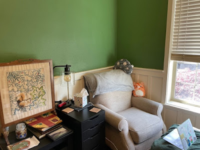 This is my writing chair where the magic happens! The new office layout of is based on this particular set-up—I have a beautiful view from this chair (stay tuned for that picture!). I usually have a real cat (or cats) on my lap, trying to get on my lap, or sitting on the ottoman. But just in case, I also have my Squishmallow cat Gigi to keep me company. The embroidered fireplace screen on the right was the one thing I bought for my office. My favorite local store often has the coolest antiques, which aren’t normally my thing, but she has a fantastic eye. I just had to have this. I love everything about it. It’s probably late19th or early 20th century from Europe – maybe Germany. The wall behind me is bare, but I already have the artwork for it. Just need to get them all framed!